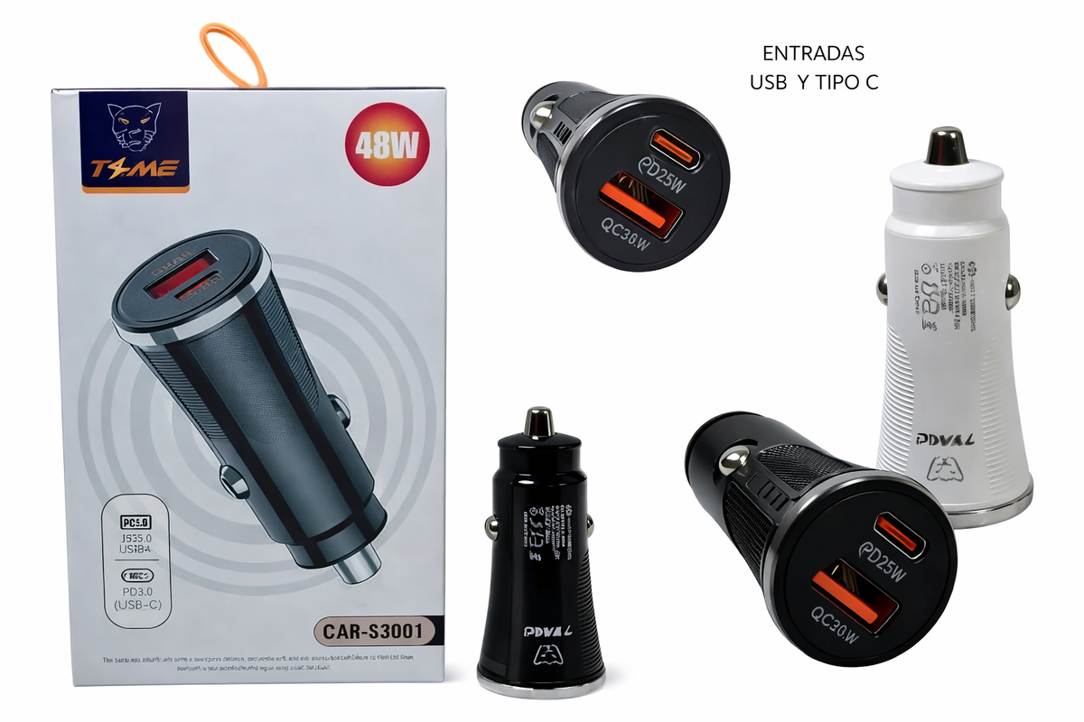 ADAPTADOR AUTO 3 PUERTOS 1 USB Y 2 TIPO C 48W MARCA TIME