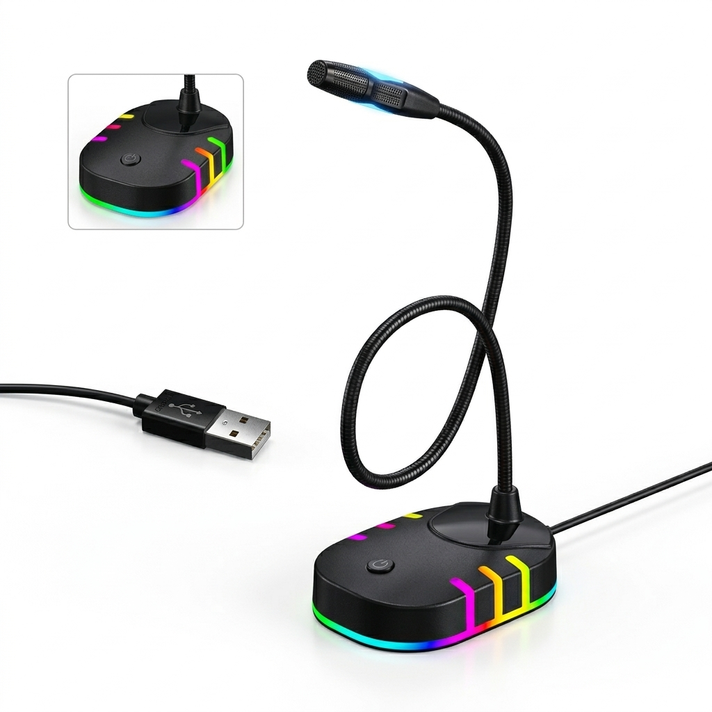 - Micrófono Gamer con luz RGB y cuello flexible para ajustar su altura o posición.