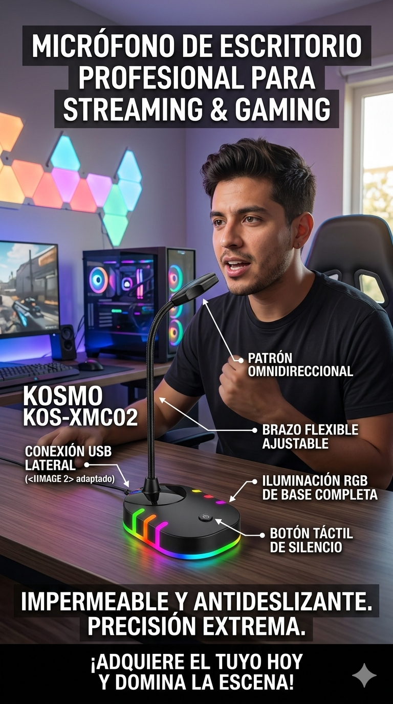Micrófono De Escritorio Kosmo KOS-XMC02 USB Omnidireccional Gamer Con Rgb para Gaming y Streaming
