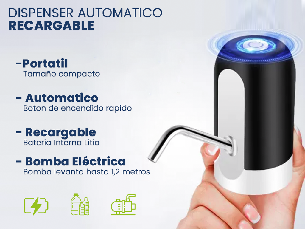 El Dispenser de Agua Eléctrico es la solución ideal para servir agua de bidones sin esfuerzo. Funciona con batería recargable y se adapta a la mayoría de los bidones estándar (10, 12 o 20 litros), lo que lo convierte en un aliado perfecto para el hogar, oficina o incluso para llevar de viaje.