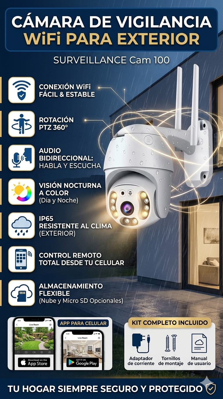 Protegé tu casa, comercio o espacio exterior con esta cámara WiFi de vigilancia, diseñada para resistir la intemperie y ofrecer monitoreo remoto desde tu celular, las 24 horas del día.