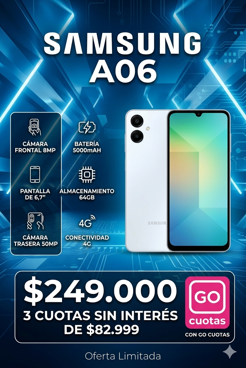 El Samsung Galaxy A06 ofrece un excelente equilibrio entre rendimiento, diseño moderno y batería duradera. Ideal para quienes buscan un smartphone confiable para el día a día, redes sociales, fotos y entretenimiento.