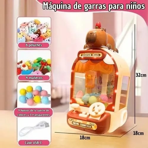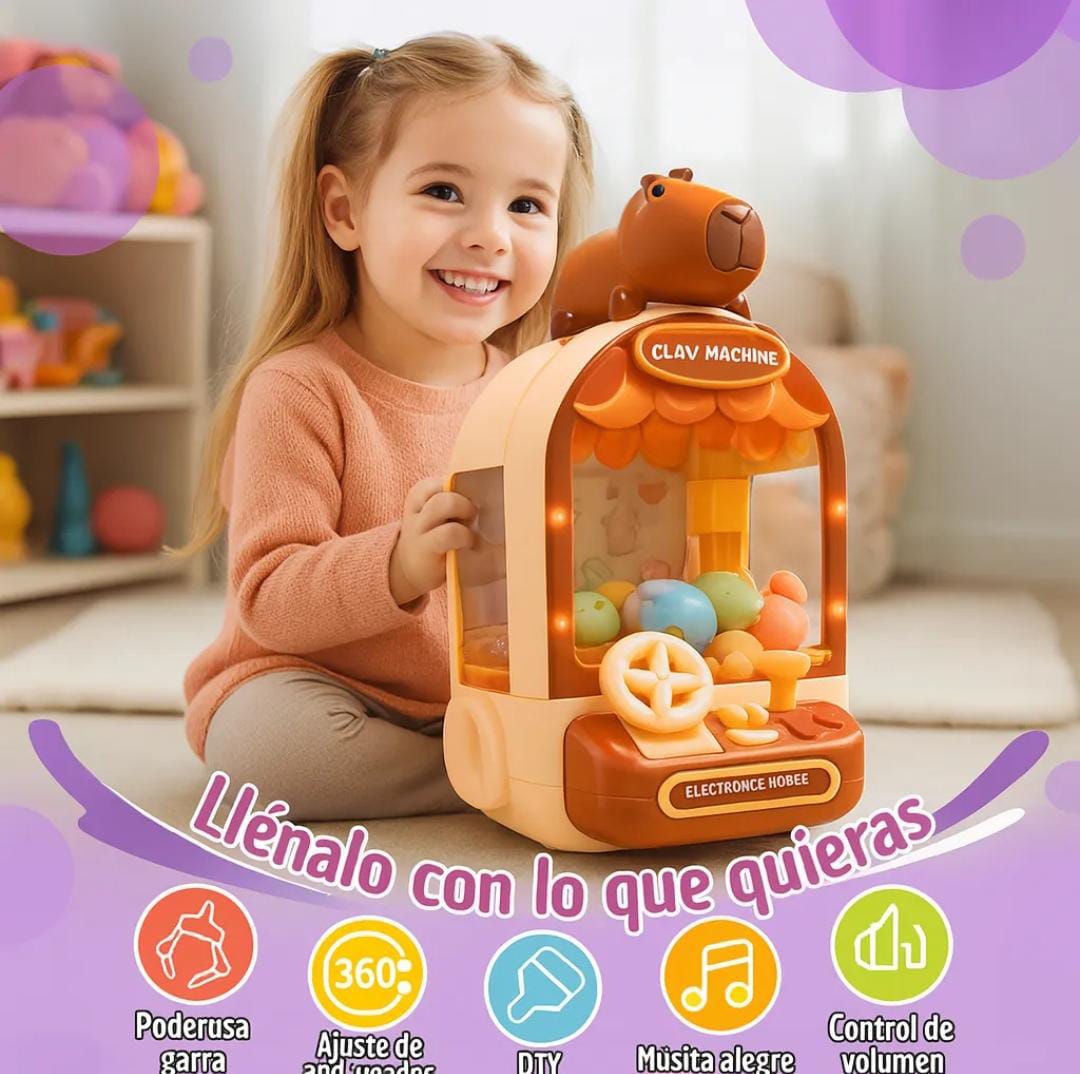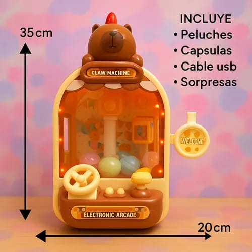La mini máquina de sacar peluches estilo Capibara es una versión adorable y portátil de las clásicas grúas de premios. Ideal para chicos y grandes, es perfecta para regalar, decorar o simplemente pasar horas de diversión intentando atrapar los mini peluches.