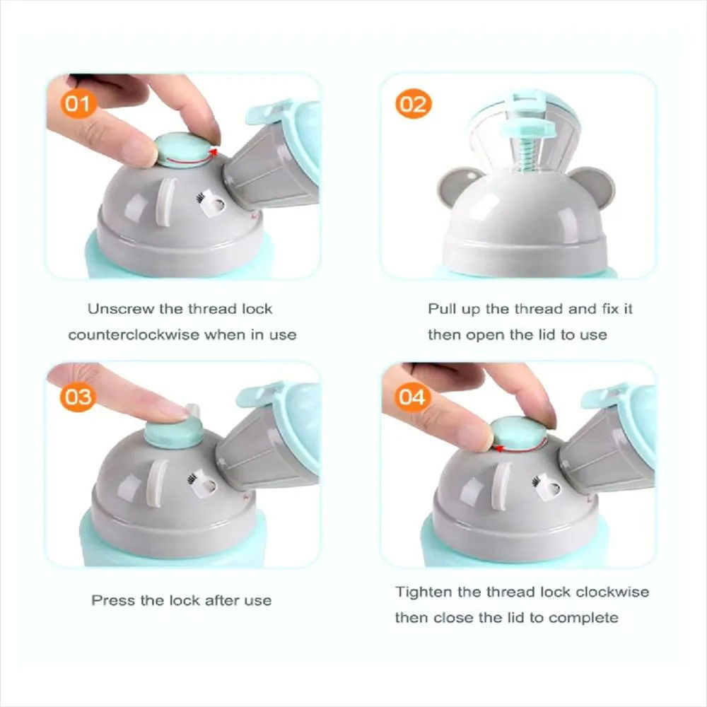 Mecanismo de Sellado/Bloqueo: La parte superior (cerca de la "cabeza del elefante") tiene una válvula o mecanismo de émbolo (la pieza azul en forma de T) que permite sellar la botella después de usarla para evitar derrames y olores.
