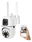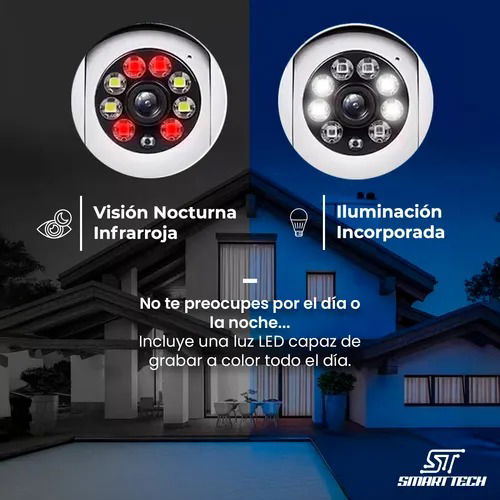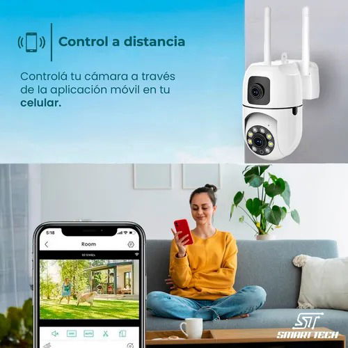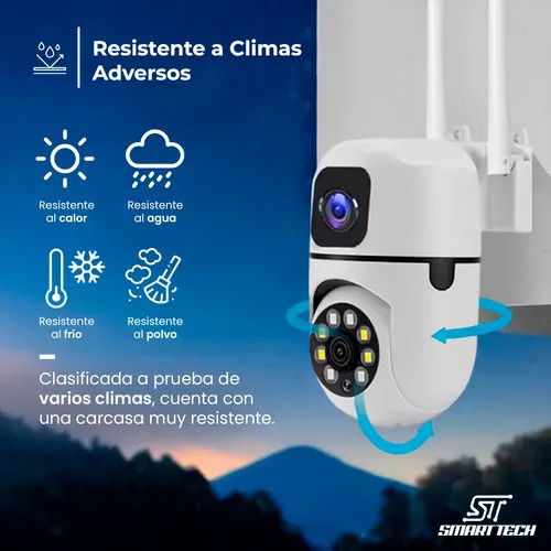 Cuenta con diseño de doble domo con doble cámara para una cobertura más completa, conexión Wi-Fi 2.4G y control remoto desde la app V380Pro. Permite grabación en tarjeta SD hasta 128 GB o en la nube. Resistente al exterior con protección IP66.
