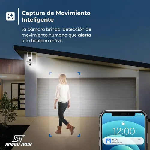 Cámara de vigilancia PTZ con giro panorámico de 360°, inclinación y zoom, ideal para hogar o negocio. Ofrece imagen Full HD 1080p, visión nocturna (infrarrojo y color), detección y seguimiento de movimiento humano, y audio bidireccional para hablar y escuchar en tiempo real.