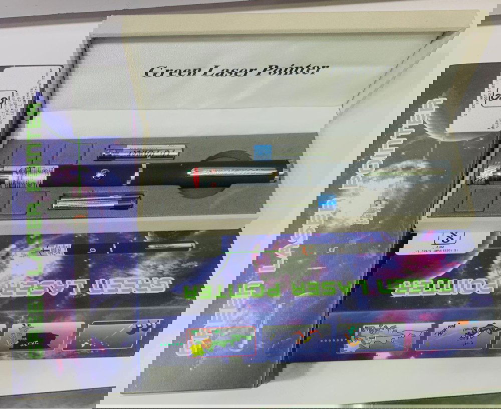 Es un puntero láser de mano que emite un rayo de luz de color verde brillante. Este tipo de láser es notablemente más visible que el rojo, especialmente a distancia o en ambientes luminosos. Se utiliza para presentaciones, astronomía (señalando estrellas) o como herramienta de precisión. El cuerpo suele ser de metal negro, alimentado por pilas, e incluye un botón de encendido lateral.