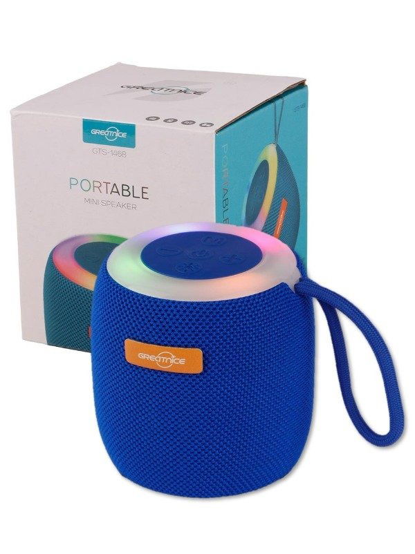 Diseño: Su forma cilíndrica está recubierta de una malla de tela de color azul intenso , y cuenta con una luz LED de colores en la parte superior, que cambia de color al ritmo de la música.
