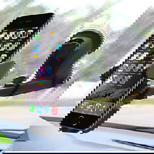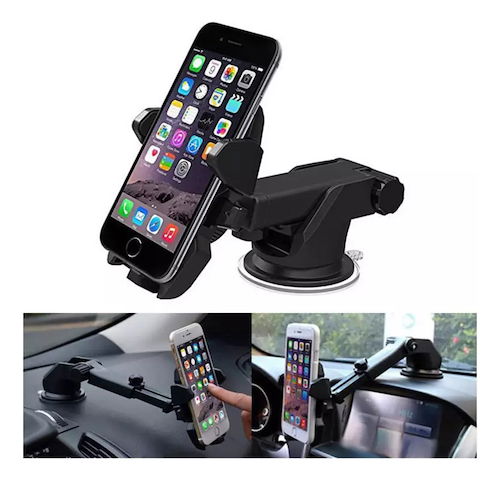 Soporte universal con brazo extensible y rotación 360°, ideal para tablero o parabrisas. Cuenta con ventosa de alta succión, sujeción firme y ajuste rápido para todo tipo de smartphones.