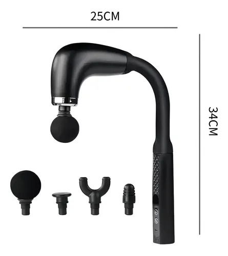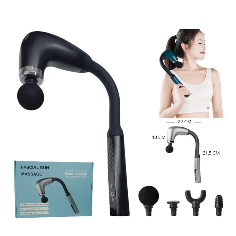 • Tipo: Pistola de masaje de percusión con diseño curvo para alcanzar espalda, cuello y hombros.