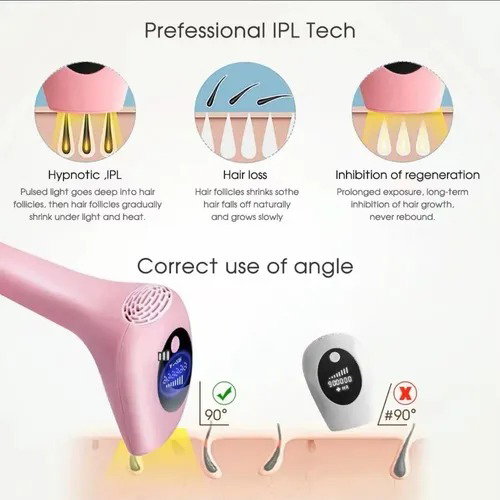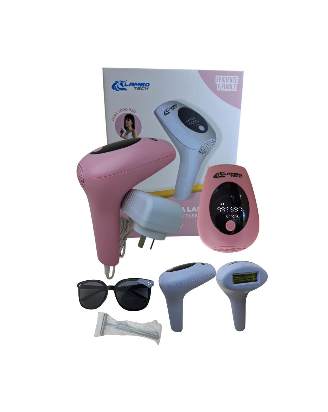 La depiladora láser Lambotech es un dispositivo que utiliza tecnología de Luz Pulsada Intensa (IPL) para la eliminación del vello a largo plazo. Está diseñada para uso facial y corporal, y viene con accesorios como gafas protectoras.