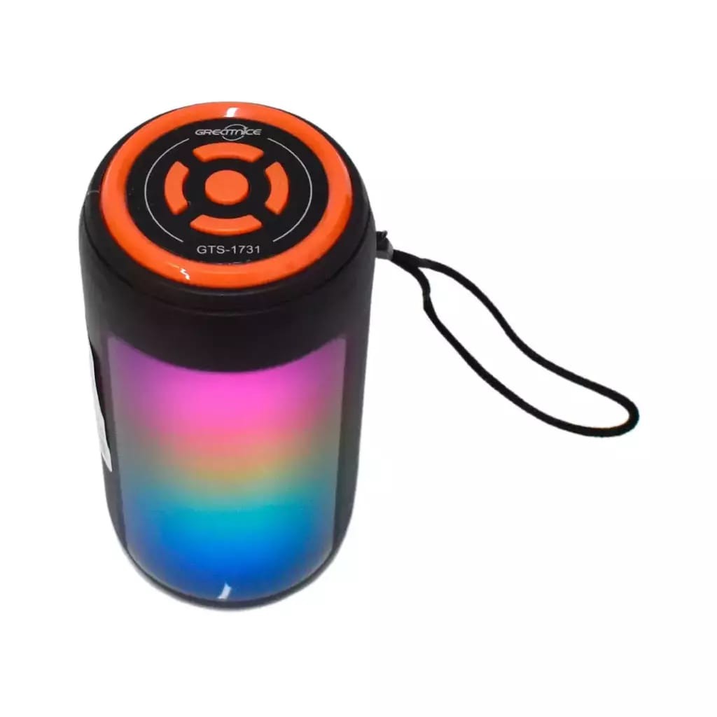Parlante portátil con sonido HD y buenos graves, ideal para llevar a todos lados. Cuenta con luces LED, radio FM, función TWS para emparejar dos parlantes y batería recargable. Reproduce música vía Bluetooth, USB o tarjeta micro SD (hasta 32 GB).